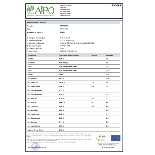 0,5 liter fles extra vergine olijfolie 2024/2025 Olijfoliecampagne, De belangrijkste cultivars in de olijfgaarden zijn Leccino, Gentile di Chieti en Coriana. De fles is gemaakt van herbruikbaar aluminium en kan eenvoudig worden bijgevuld via de kraan op de bag-in-box